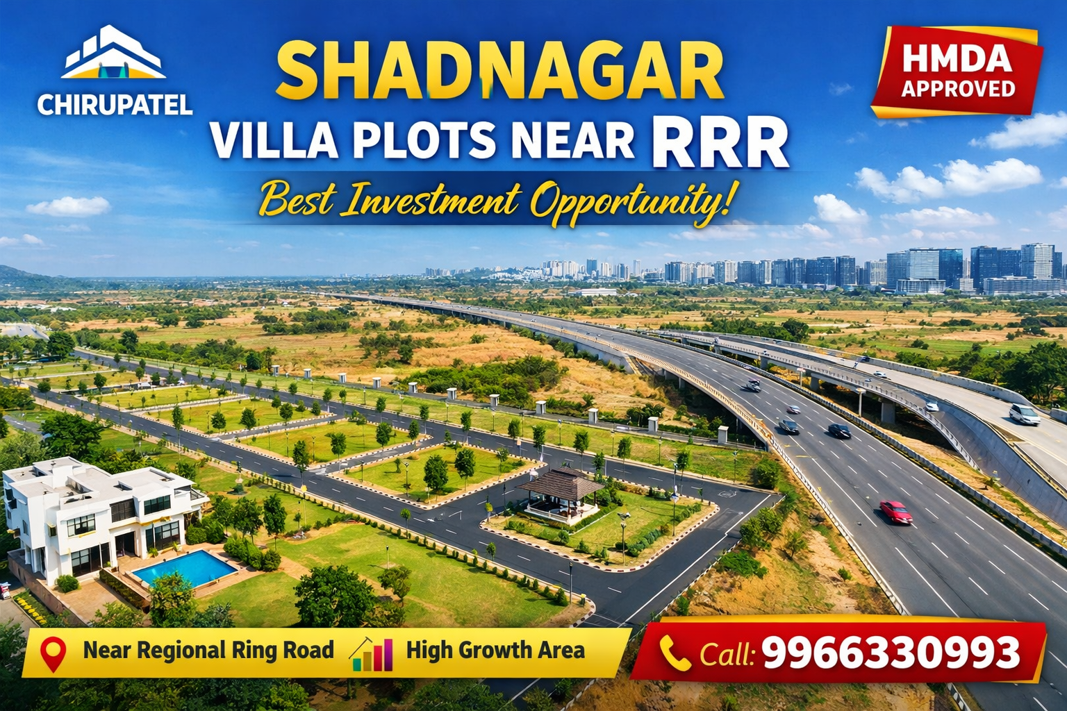 Shadnagar villa plots near RRR are HMDA-approved open plots located in one of Hyderabad’s fastest-growing investment corridors. These plots are ideal for villa construction and long-term appreciation due to excellent connectivity, proximity to the Regional Ring Road (RRR), and rapid infrastructure development. Chirupatel brings verified, approved, and future-ready plot projects in Shadnagar for safe and high-return investment.